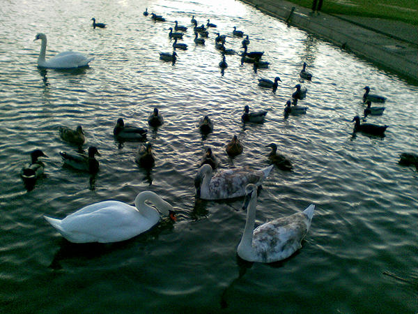 посередине парка был типа пруд только с бордюром, где кусты были и плавали много уток и лебеди
